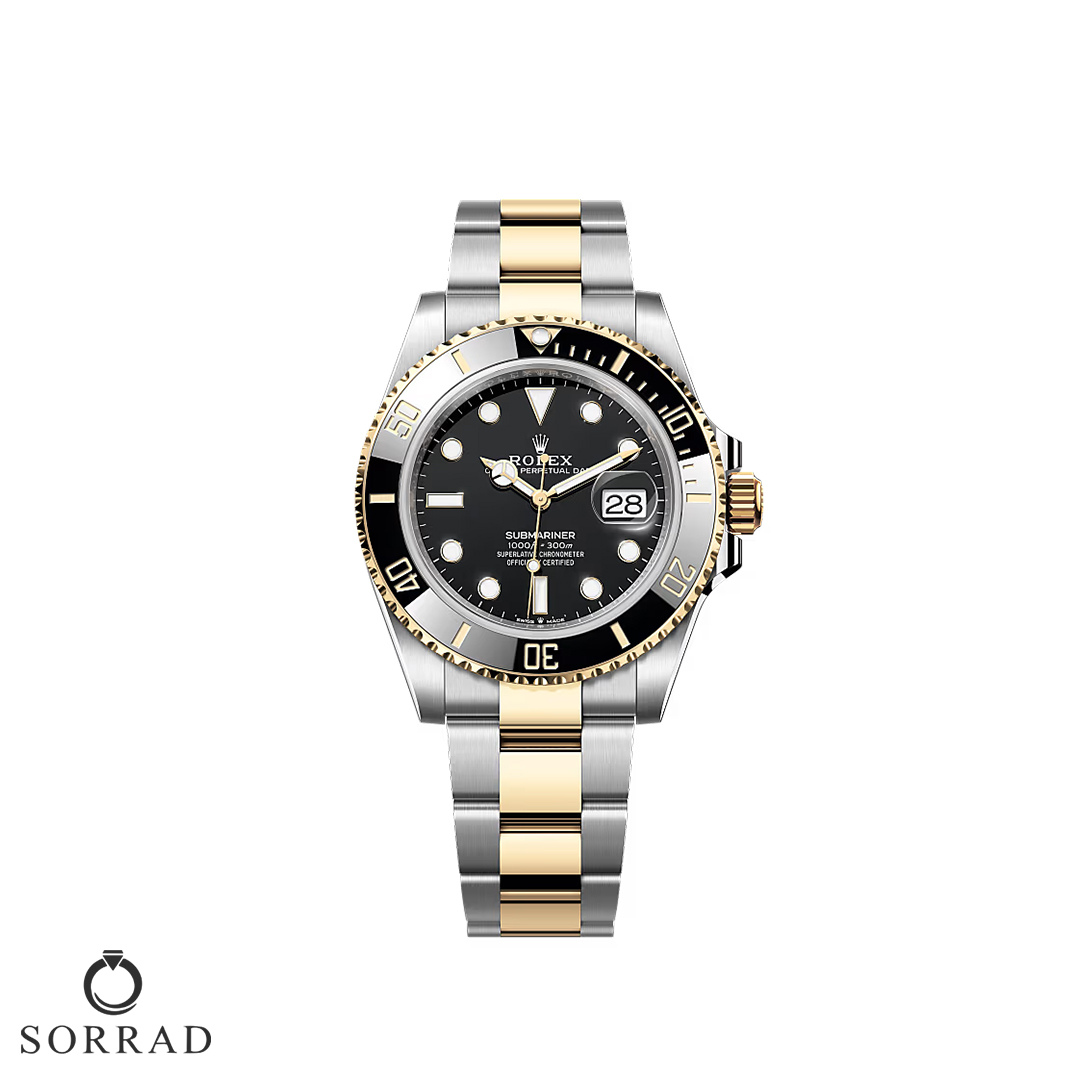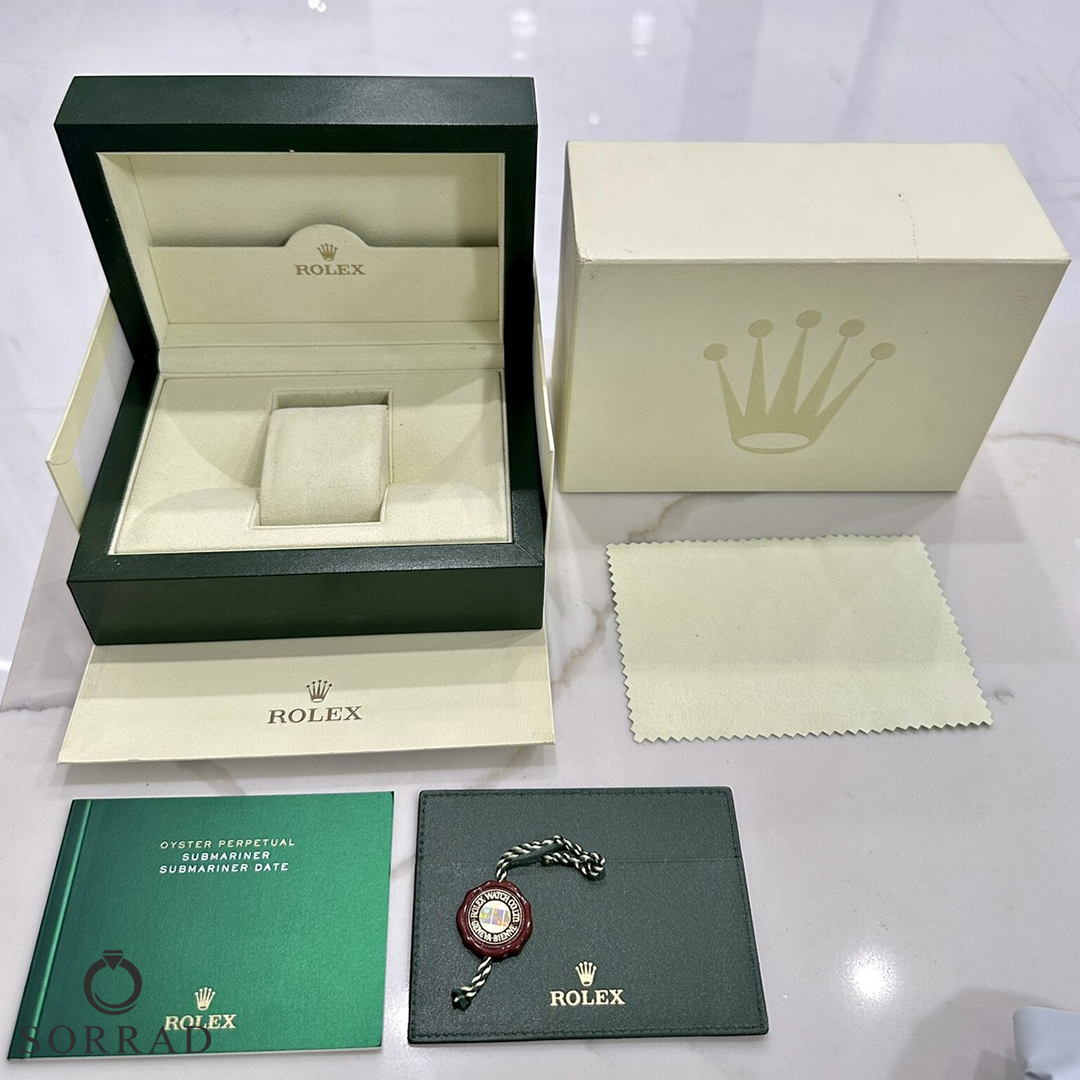 ساعت Oyster Perpetual Submariner Date مسترکوآلیتی از جنس اویستراستیل و طلای زرد . صفحه سرامیکی مشکی از جنس سراکروم . صفحه مشکی با شاخصهای بزرگ و شبتاب. به همراه پک اصلی رولکس