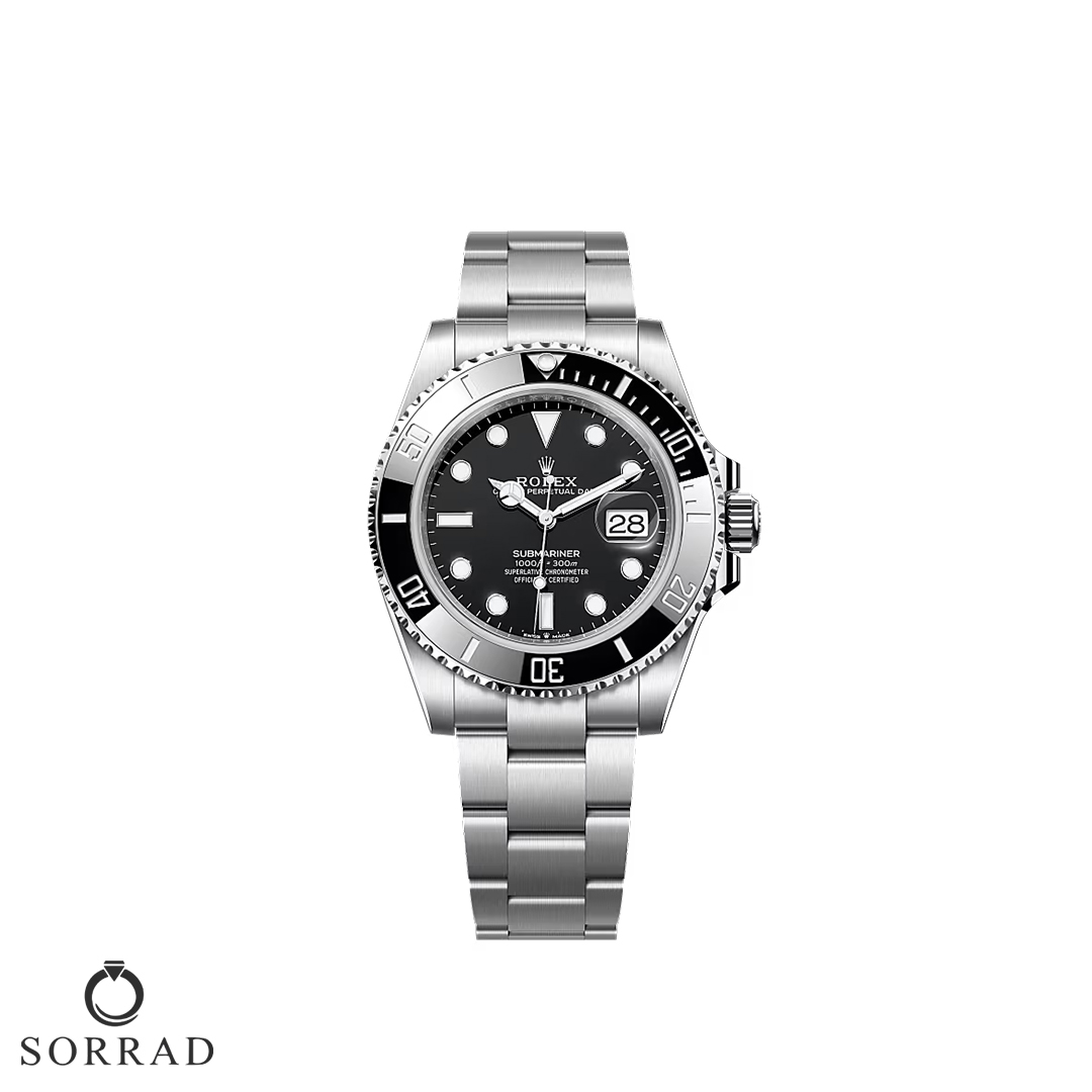 ساعت Oyster Perpetual Submariner Date مسترکوآلیتی از جنس اویستراستیل و طلای زرد . صفحه سرامیکی مشکی از جنس سراکروم . صفحه مشکی با شاخص‌های بزرگ و شب‌تاب. به همراه پک اصلی رولکس